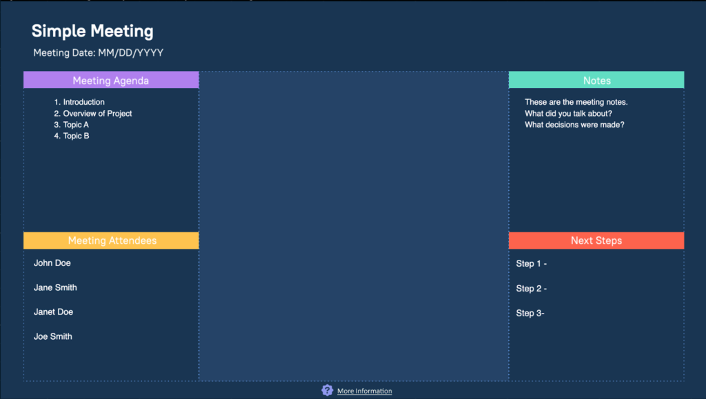 The Simple Meeting template is used by businesses or individuals to organize their everyday virtual meeting space.